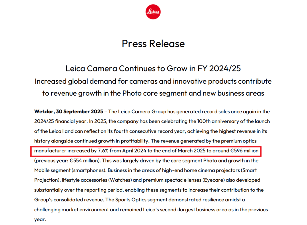 其次,增长可能触顶了,上一财年徕卡的营收增速放缓到了 7.6%,虽然还在涨,但势头明显不如前几年猛。