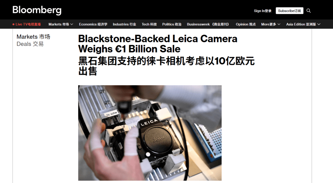 据彭博社最新爆料:徕卡相机两大股东正联合寻求出售公司控股权,其中美国私募巨头黑石拟清仓所持全部45%股份,持有55%控股权的考夫曼家族也同步推进股权出售,此次交易中徕卡整体估值约10亿欧元,折合人民币约82.46亿。